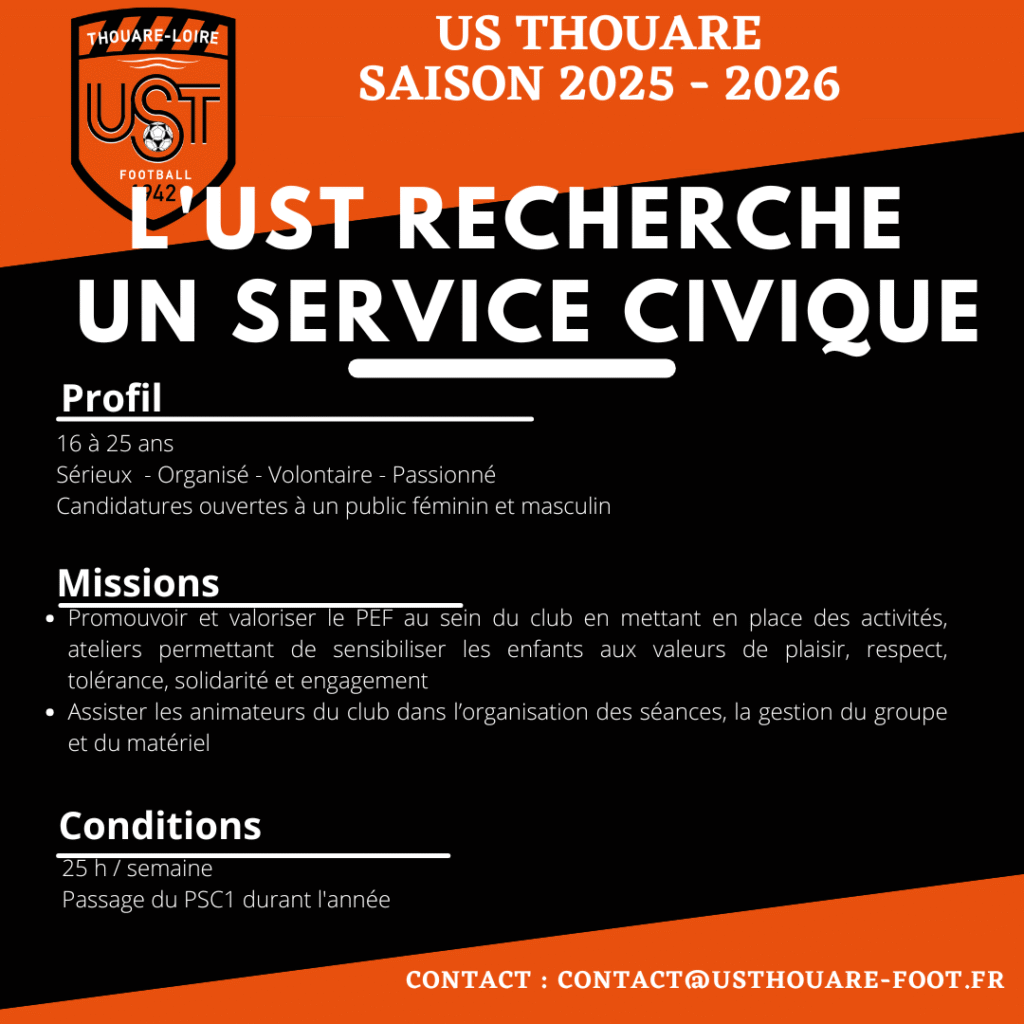 Le club recherche une personne pour une mission de Service Civique pour renforcer son équipe d’encadrement. Les conditions : vous êtes âgé(e)s de 18 à 25 ans, aucune condition de diplôme, vous pratiquez le football vous êtes disponible, et de Nationalité Française, vous êtes sensible à la transmission de valeurs éducatives, vous connaissez les outils