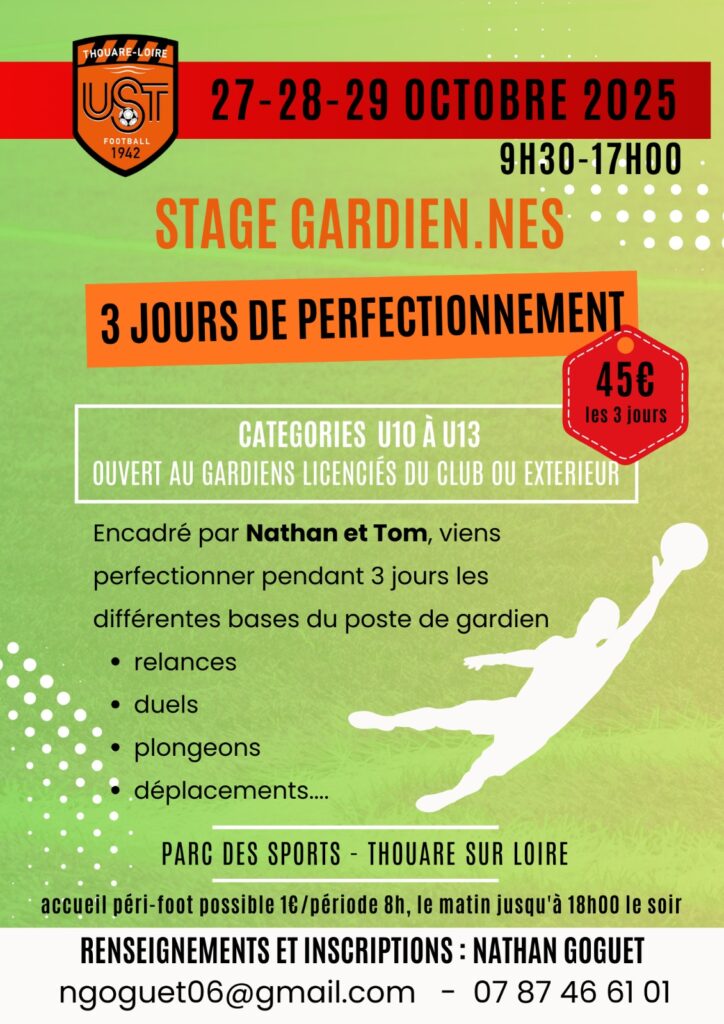 Un stage spécifique Gardiens de buts est organisé les 27-28-29 octobre au Parc des Sports de Thouaré. Le stage concernera les catégories U10 à U13 de l’US Thouaré et des clubs des alentours. Obligation d’avoir une licence football et d’être gardien de but pour y participer. Fonctionnement du stage : Le stage débutera à 9h30